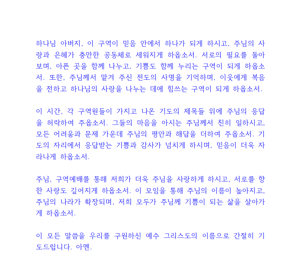하나님 아버지, 이 구역이 믿음 안에서 하나가 되게 하시고, 주님의 사랑과 은혜가 충만한 공동체로 세워지게 하옵소서. 서로의 필요를 돌아보며, 아픈 곳을 함께 나누고, 기쁨도 함께 누리는 구역이 되게 하옵소서. 또한, 주님께서 맡겨 주신 전도의 사명을 기억하며, 이웃에게 복음을 전하고 하나님의 사랑을 나누는 데에 힘쓰는 구역이 되게 하옵소서.