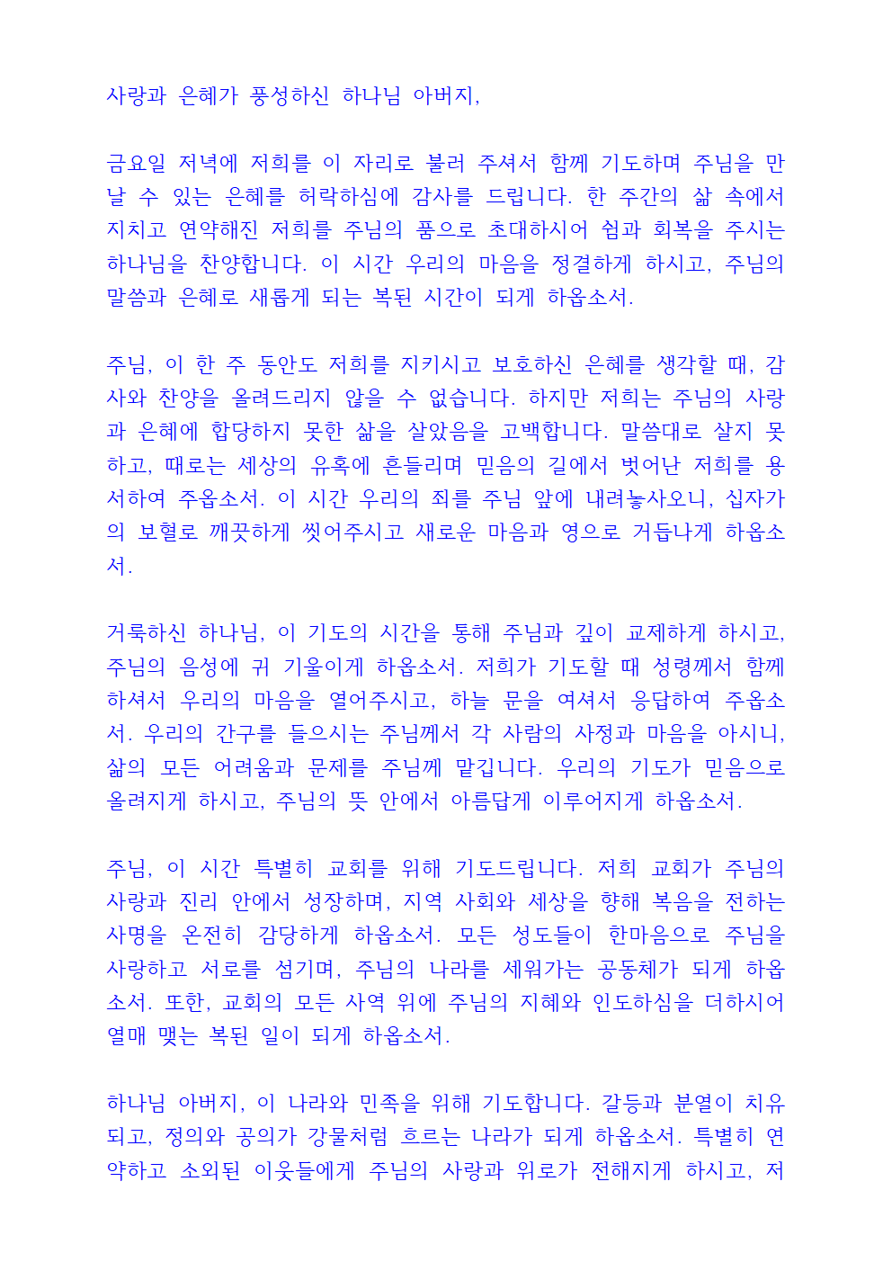 특별히 이 금요기도회가 성령의 임재로 가득한 시간이 되게 하옵소서. 저희가 드리는 찬양과 기도 가운데 주님의 영광이 나타나게 하시고, 우리의 마음이 더욱 주님을 사모하며 의지하게 하옵소서. 기도의 자리를 떠날 때에 새로운 힘과 소망을 가지고 돌아가게 하시며, 우리의 삶 속에서 주님을 증거하는 참된 예배자가 되게 하옵소서.