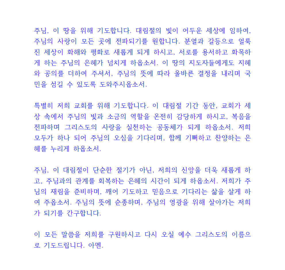 주님, 이 땅을 위해 기도합니다. 대림절의 빛이 어두운 세상에 임하여, 주님의 사랑이 모든 곳에 전파되기를 원합니다. 분열과 갈등으로 얼룩진 세상이 화해와 평화로 새롭게 되게 하시고, 서로를 용서하고 화목하게 하는 주님의 은혜가 넘치게 하옵소서. 이 땅의 지도자들에게도 지혜와 공의를 더하여 주셔서, 주님의 뜻에 따라 올바른 결정을 내리며 국민을 섬길 수 있도록 도와주시옵소서.