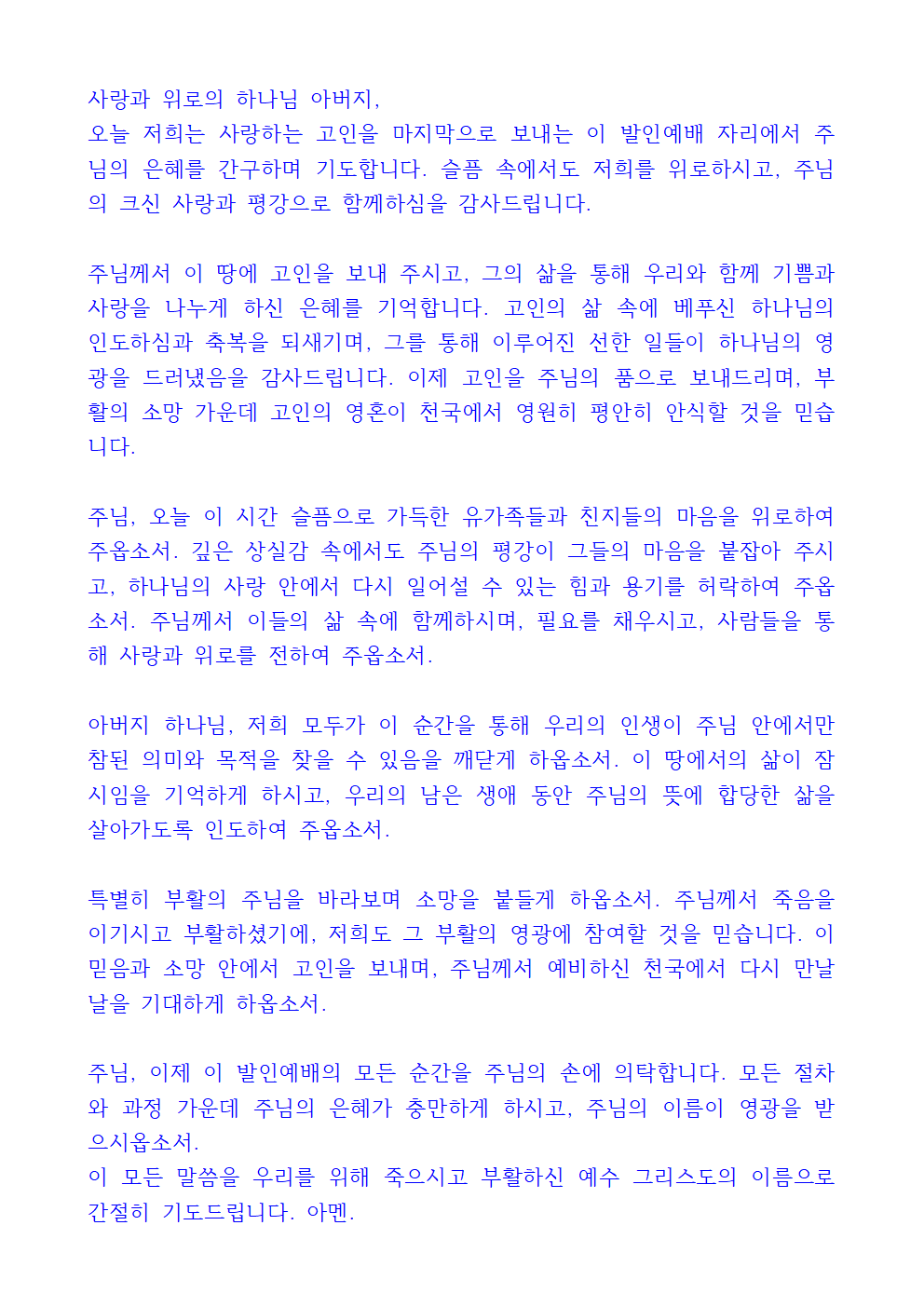 주님께서 이 땅에 고인을 보내 주시고, 그의 삶을 통해 우리와 함께 기쁨과 사랑을 나누게 하신 은혜를 기억합니다. 고인의 삶 속에 베푸신 하나님의 인도하심과 축복을 되새기며, 그를 통해 이루어진 선한 일들이 하나님의 영광을 드러냈음을 감사드립니다. 이제 고인을 주님의 품으로 보내드리며, 부활의 소망 가운데 고인의 영혼이 천국에서 영원히 평안히 안식할 것을 믿습니다.