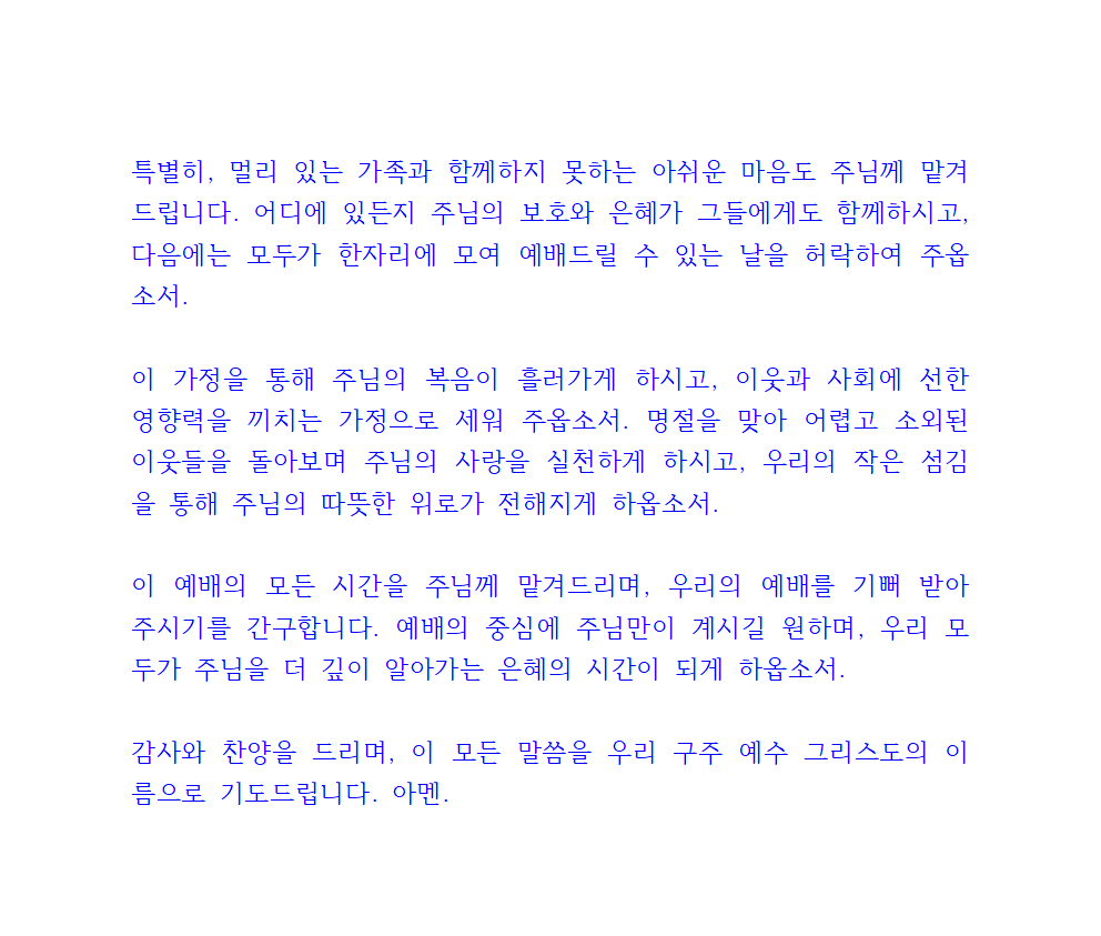 특별히, 멀리 있는 가족과 함께하지 못하는 아쉬운 마음도 주님께 맡겨드립니다. 어디에 있든지 주님의 보호와 은혜가 그들에게도 함께하시고, 다음에는 모두가 한자리에 모여 예배드릴 수 있는 날을 허락하여 주옵소서.