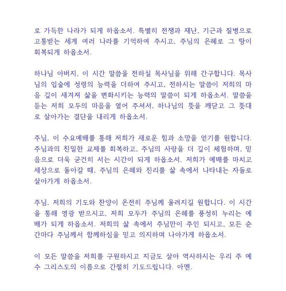 주님, 이 수요예배를 통해 저희가 새로운 힘과 소망을 얻기를 원합니다. 주님과의 친밀한 교제를 회복하고, 주님의 사랑을 더 깊이 체험하며, 믿음으로 더욱 굳건히 서는 시간이 되게 하옵소서. 저희가 예배를 마치고 세상으로 돌아갈 때, 주님의 은혜와 진리를 삶 속에서 나타내는 자들로 살아가게 하옵소서.