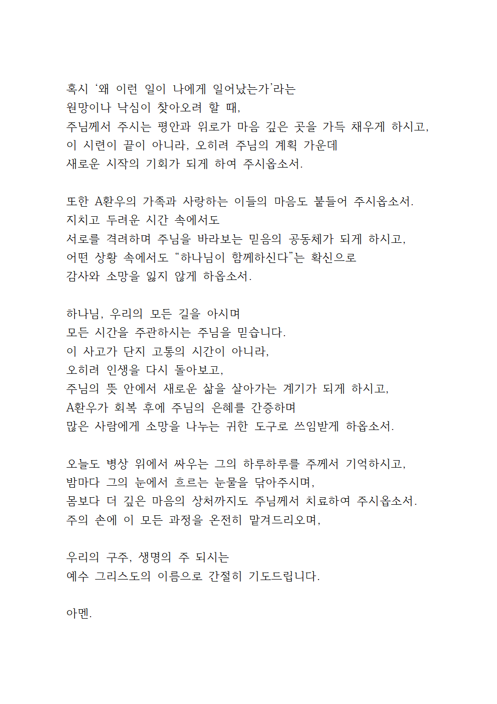 하나님, 우리의 모든 길을 아시며 모든 시간을 주관하시는 주님을 믿습니다. 이 사고가 단지 고통의 시간이 아니라, 오히려 인생을 다시 돌아보고, 주님의 뜻 안에서 새로운 삶을 살아가는 계기가 되게 하시고, A환우가 회복 후에 주님의 은혜를 간증하며 많은 사람에게 소망을 나누는 귀한 도구로 쓰임 받게 하옵소서.