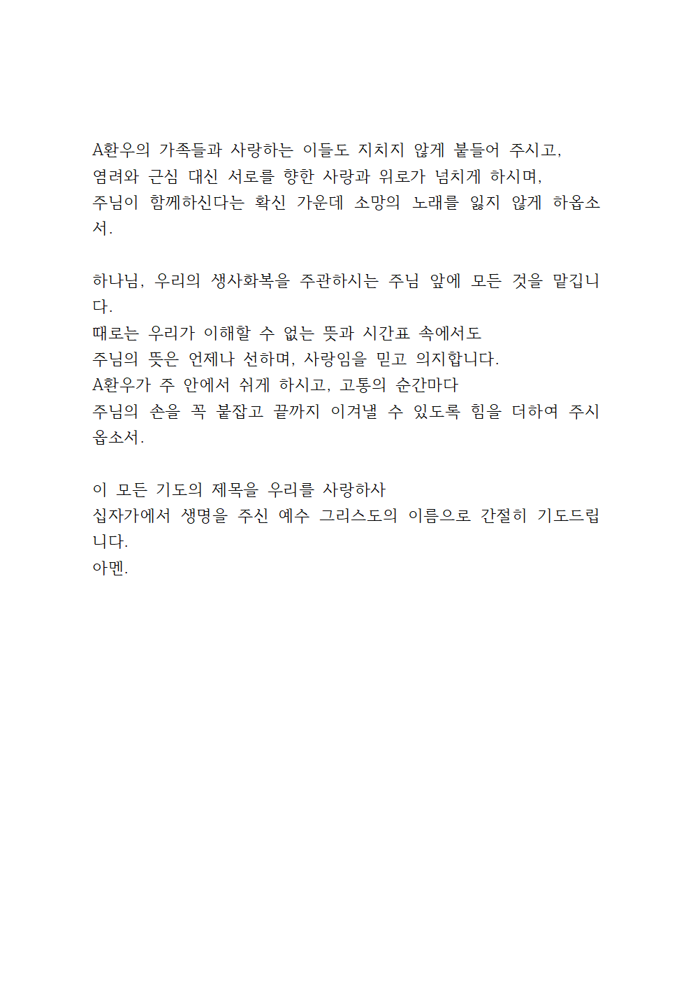 또한 A환우의 가족과 사랑하는 이들의 마음도 붙들어 주시옵소서. 지치고 두려운 시간 속에서도 서로를 격려하며 주님을 바라보는 믿음의 공동체가 되게 하시고, 어떤 상황 속에서도 “하나님이 함께하신다”는 확신으로 감사와 소망을 잃지 않게 하옵소서.