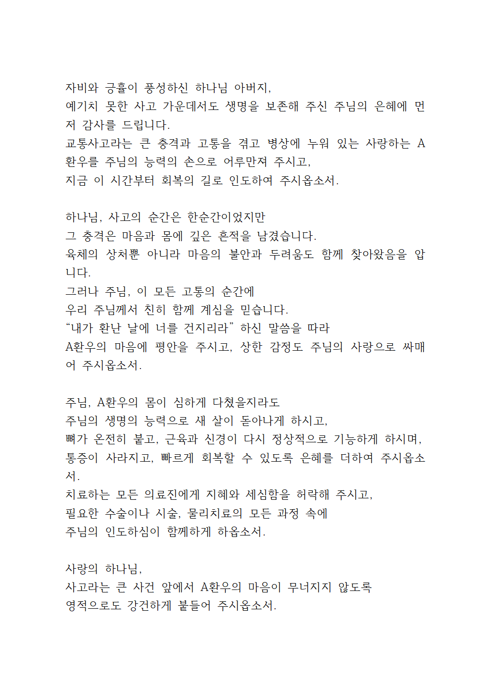 이번 글에서는 교통사고로 인해 입원한 A를 위한 입원 환자를 위한 기도문을 안내해 드리겠습니다.