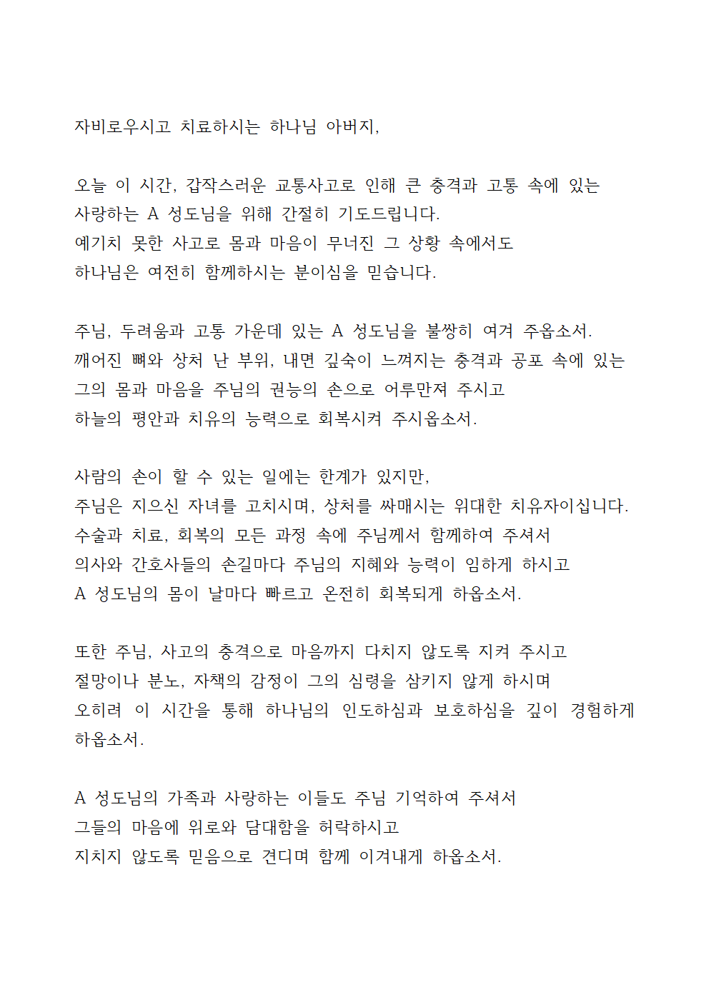 "A"님의 갑작스러운 사고의 충격과 회복 과정에 하나님의 긍휼하심이 가득하기를 간구하는 기도라면 참 좋을 것 같습니다.