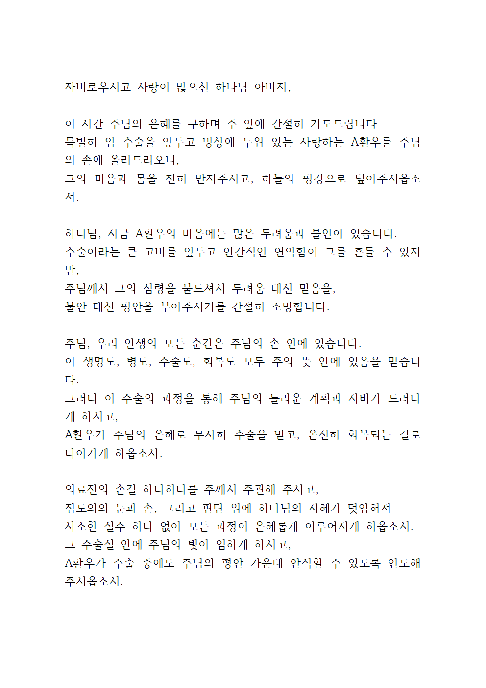 오늘도 병상 위에서 싸우는 그의 하루하루를 주께서 기억하시고, 밤마다 그의 눈에서 흐르는 눈물을 닦아주시며, 몸보다 더 깊은 마음의 상처까지도 주님께서 치료하여 주시옵소서. 주의 손에 이 모든 과정을 온전히 맡겨드리오며,