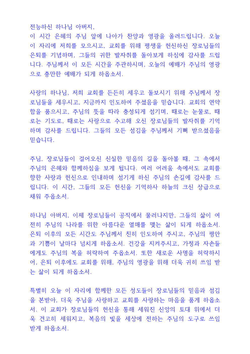하나님 아버지, 이제 장로님들이 공직에서 물러나지만, 그들의 삶이 여전히 주님의 나라를 위한 아름다운 열매를 맺는 삶이 되게 하옵소서. 은퇴 이후의 모든 시간도 주님께서 친히 인도하여 주시고, 주님의 평안과 기쁨이 날마다 넘치게 하옵소서. 건강을 지켜주시고, 가정과 자손들에게도 주님의 복을 허락하여 주옵소서. 또한 새로운 사명을 허락하시어, 은퇴 이후에도 교회를 위해, 주님의 영광을 위해 더욱 귀히 쓰임 받는 삶이 되게 하옵소서.