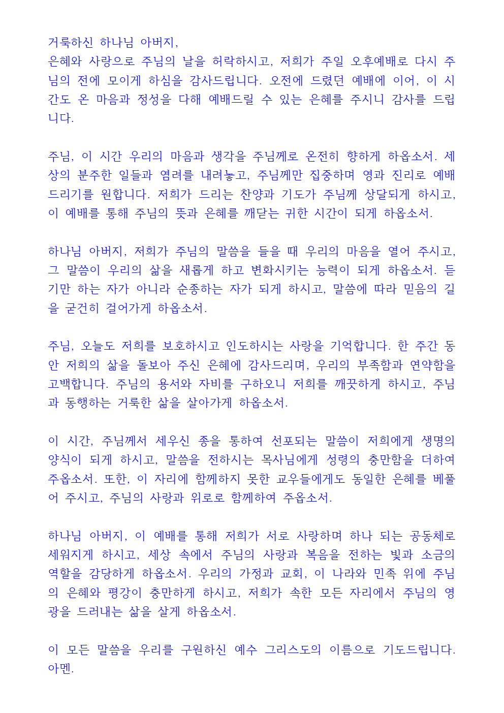 주일오후예배 대표기도문 내용