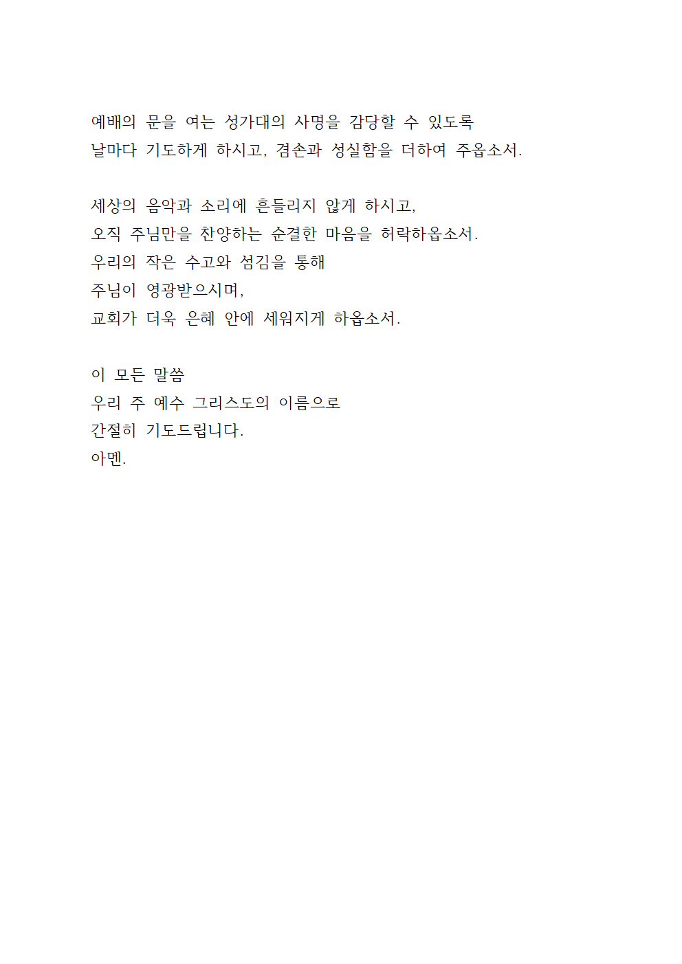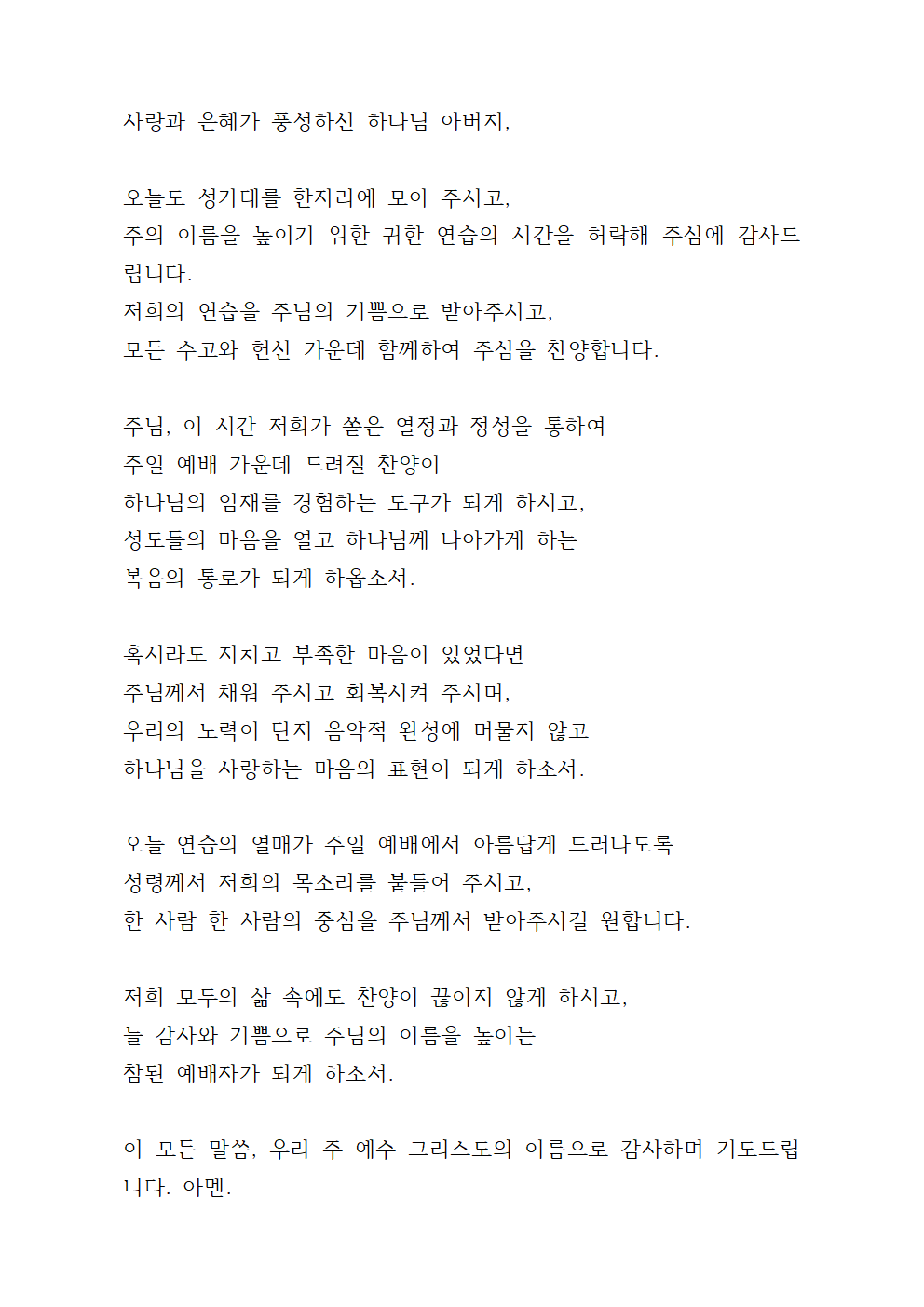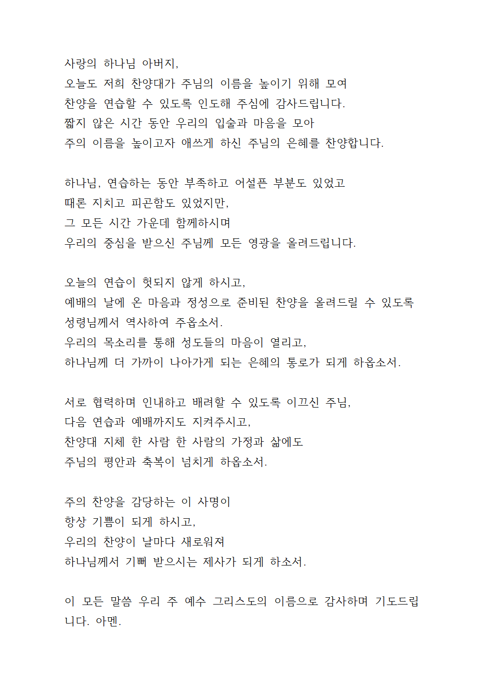 이번 글에서는 찬양대 연습 전 기도문을 안내해 드리겠습니다.