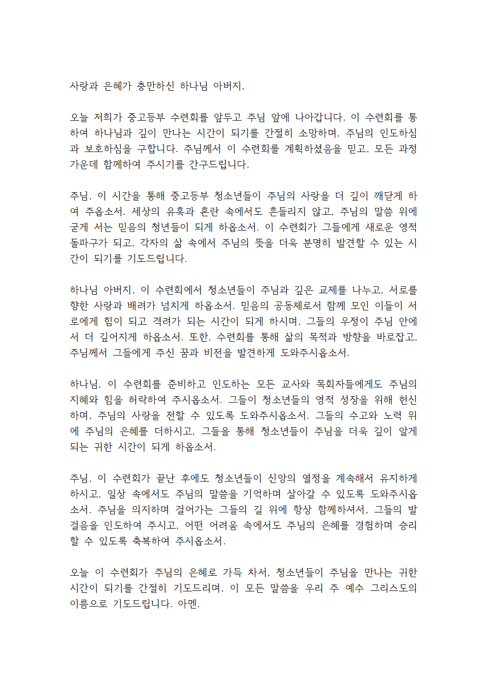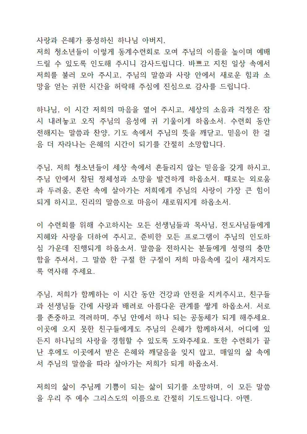 청소년교회 동계수련회 기도문 내용