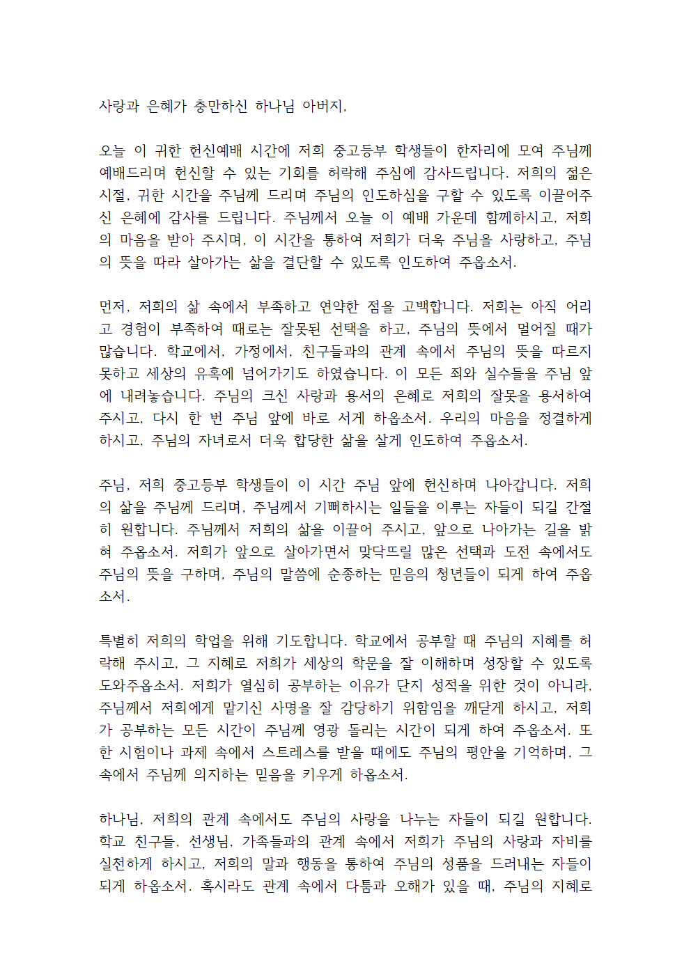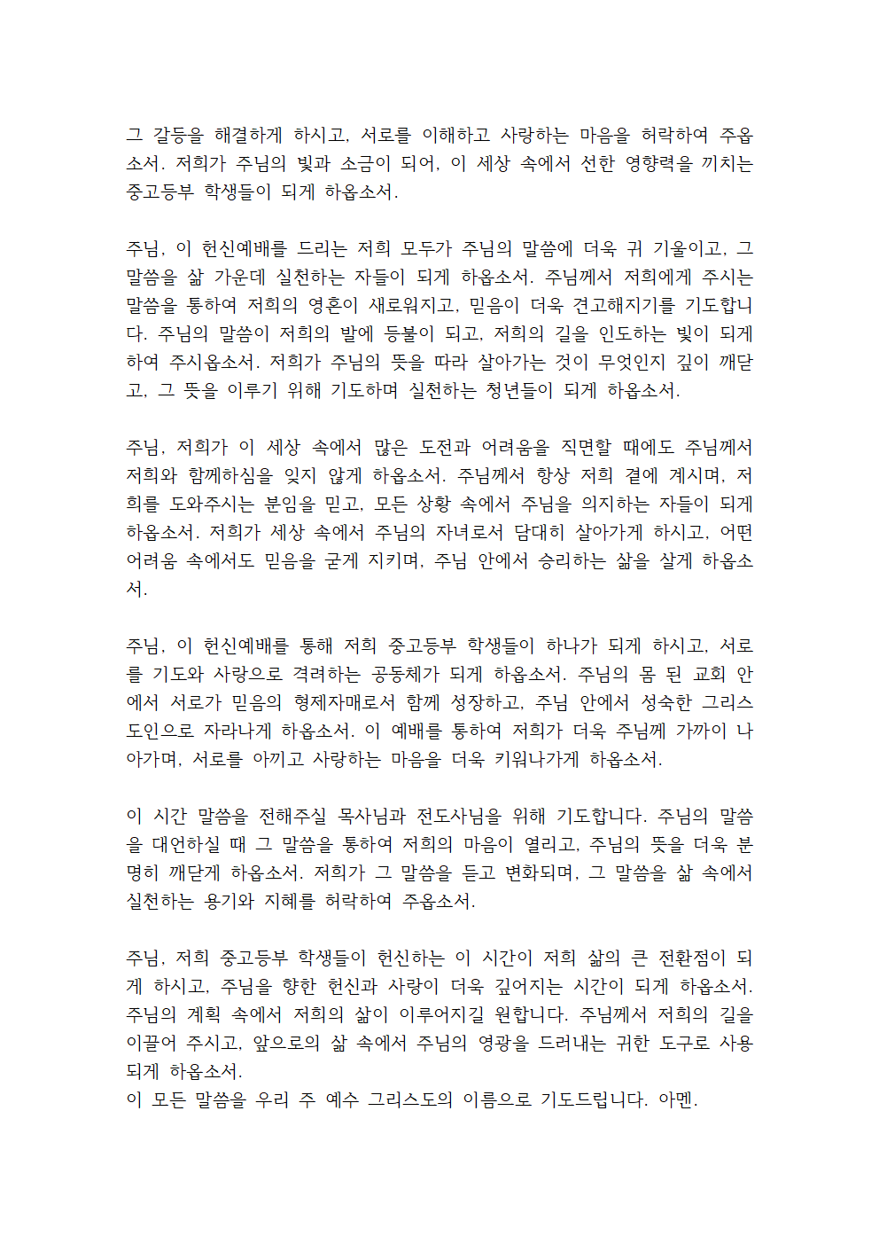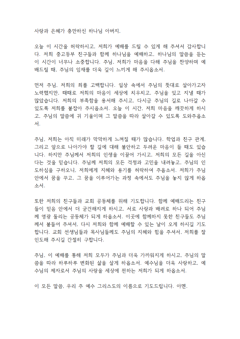 주님, 저희가 함께하는 이 시간 동안 건강과 안전을 지켜주시고, 친구들과 선생님들 간에 사랑과 배려로 아름다운 관계를 쌓게 하옵소서. 서로를 존중하고 격려하며, 주님 안에서 하나 되는 공동체가 되게 해주세요.