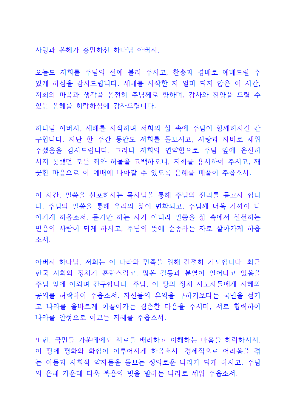 하나님 아버지, 새해를 시작하며 저희의 삶 속에 주님이 함께하시길 간구합니다. 지난 한 주간 동안도 저희를 돌보시고, 사랑과 자비로 채워 주셨음을 감사드립니다. 그러나 저희의 연약함으로 주님 앞에 온전히 서지 못했던 모든 죄와 허물을 고백하오니, 저희를 용서하여 주시고, 깨끗한 마음으로 이 예배에 나아갈 수 있도록 은혜를 베풀어 주옵소서.