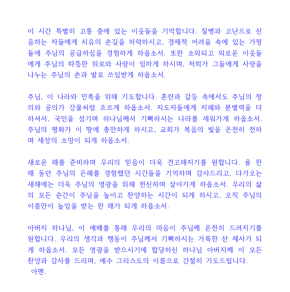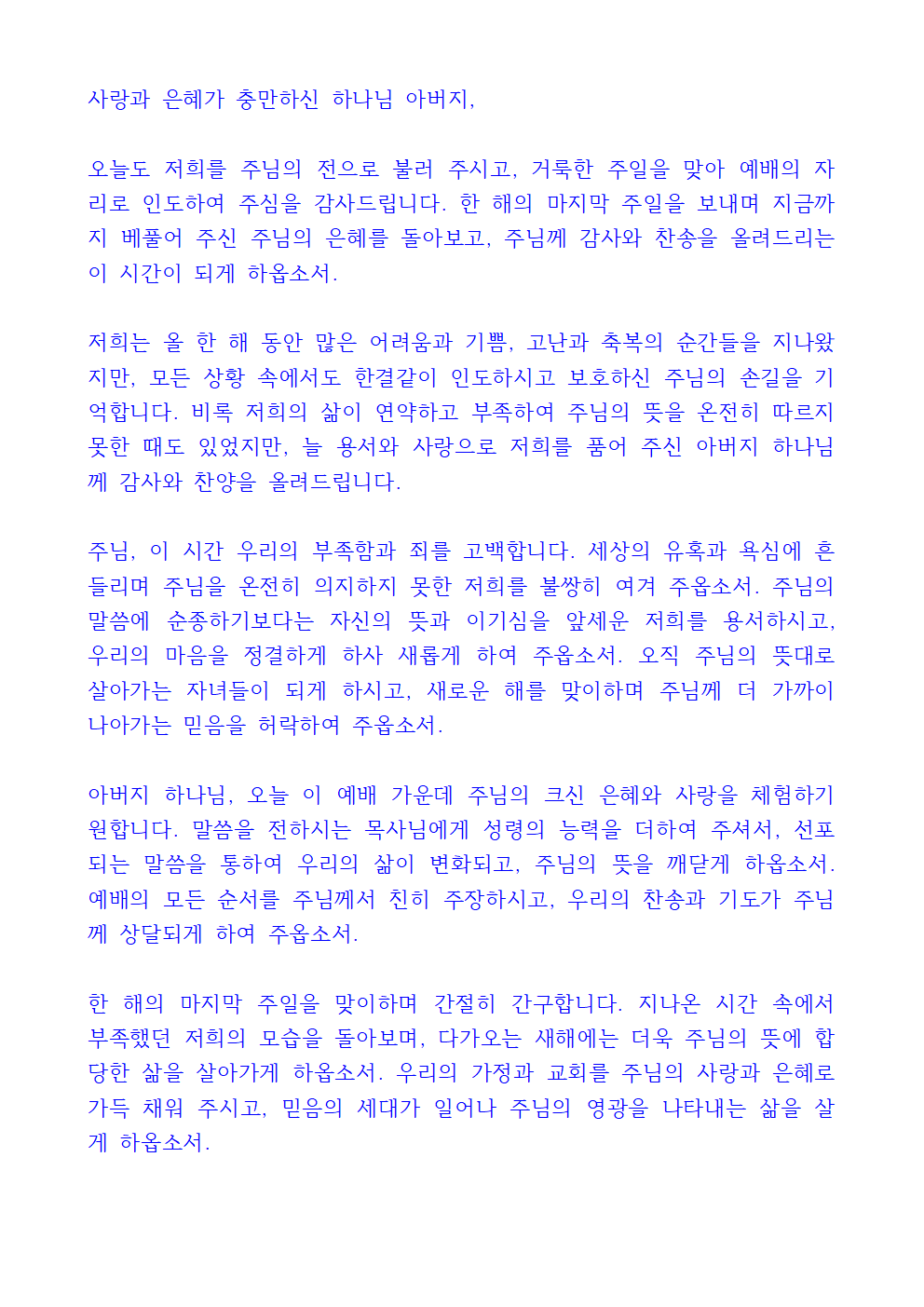 한 해의 마지막 주일을 맞이하며 간절히 간구합니다. 지나온 시간 속에서 부족했던 저희의 모습을 돌아보며, 다가오는 새해에는 더욱 주님의 뜻에 합당한 삶을 살아가게 하옵소서. 우리의 가정과 교회를 주님의 사랑과 은혜로 가득 채워 주시고, 믿음의 세대가 일어나 주님의 영광을 나타내는 삶을 살게 하옵소서.