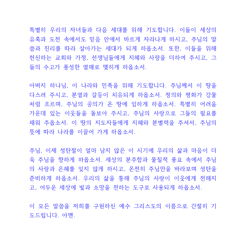 주님, 이제 성탄절이 얼마 남지 않은 이 시기에 우리의 삶과 마음이 더욱 주님을 향하게 하옵소서. 세상의 분주함과 물질적 풍요 속에서 주님의 사랑과 은혜를 잊지 않게 하시고, 온전히 주님만을 바라보며 성탄을 준비하게 하옵소서. 우리의 삶을 통해 주님의 사랑이 이웃에게 전해지고, 어두운 세상에 빛과 소망을 전하는 도구로 사용되게 하옵소서.