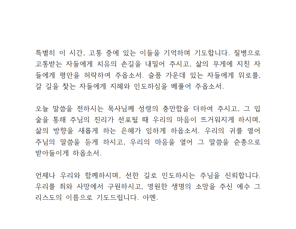 오늘 말씀을 전하시는 목사님께 성령의 충만함을 더하여 주시고, 그 입술을 통해 주님의 진리가 선포될 때 우리의 마음이 뜨거워지게 하시며, 삶의 방향을 새롭게 하는 은혜가 임하게 하옵소서. 우리의 귀를 열어 주님의 말씀을 듣게 하시고, 우리의 마음을 열어 그 말씀을 순종으로 받아들이게 하옵소서.