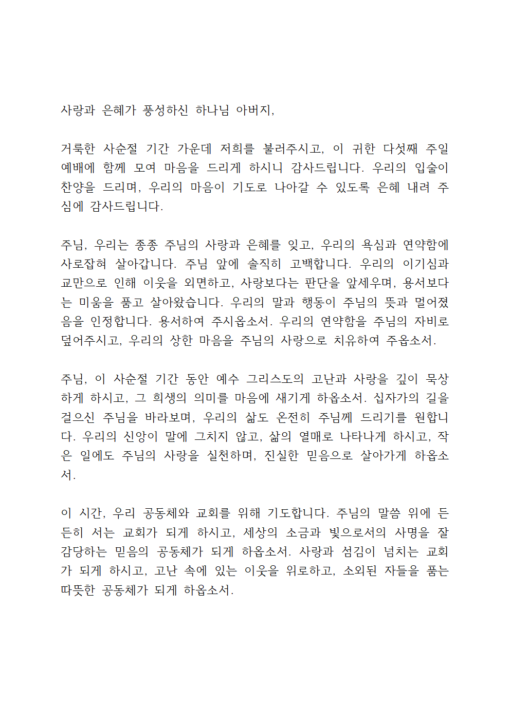 3월 다섯째 주일 낮예배 대표기도문 내용