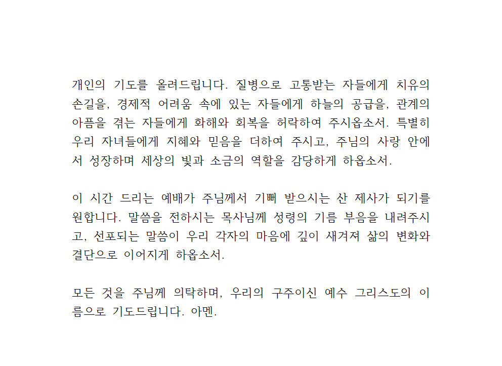 또한 이 나라와 민족을 위해 기도합니다. 정의와 평화가 강물처럼 흐르게 하시고, 사회의 약자들과 고통받는 이들에게 주님의 위로와 사랑이 전해지게 하옵소서. 지도자들에게 바른 판단과 공의를 행하는 용기를 주시고, 모든 국민이 서로 사랑하고 존중하는 공동체를 이루게 하옵소서.