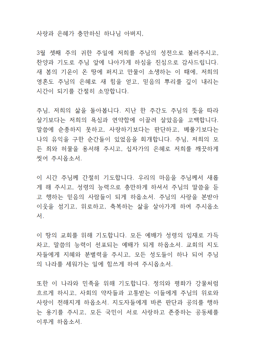 3월 셋째 주의 귀한 주일에 저희를 주님의 성전으로 불러주시고, 찬양과 기도로 주님 앞에 나아가게 하심을 진심으로 감사드립니다. 새 봄의 기운이 온 땅에 퍼지고 만물이 소생하는 이 때에, 저희의 영혼도 주님의 은혜로 새 힘을 얻고, 믿음의 뿌리를 깊이 내리는 시간이 되기를 간절히 소망합니다.