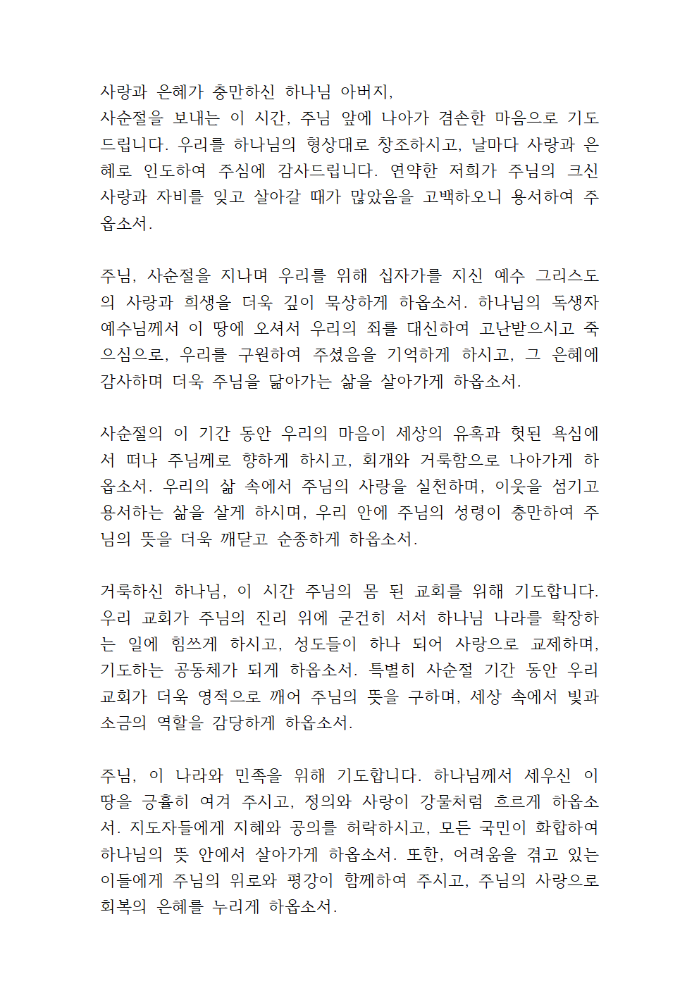 사순절의 이 기간 동안 우리의 마음이 세상의 유혹과 헛된 욕심에서 떠나 주님께로 향하게 하시고, 회개와 거룩함으로 나아가게 하옵소서. 우리의 삶 속에서 주님의 사랑을 실천하며, 이웃을 섬기고 용서하는 삶을 살게 하시며, 우리 안에 주님의 성령이 충만하여 주님의 뜻을 더욱 깨닫고 순종하게 하옵소서.
