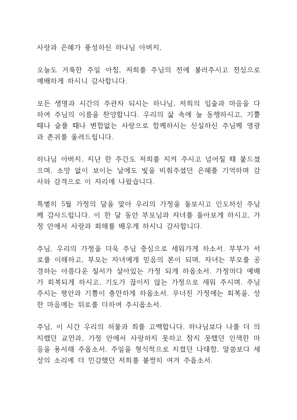 그러나 주님, 저희의 삶을 돌아보면, 때로는 가정 안에서도 주님의 뜻대로 살지 못하고, 불평과 다툼으로 관계를 깨뜨렸음을 고백합니다. 하나님께서 주신 소중한 관계들을 소홀히 하고, 사랑보다는 이기심을 앞세운 저희의 죄를 용서하여 주옵소서. 주님의 자비로 저희의 마음을 새롭게 하시고, 이 시간 드리는 예배를 통하여 회복과 치유의 은혜를 경험하게 하소서.