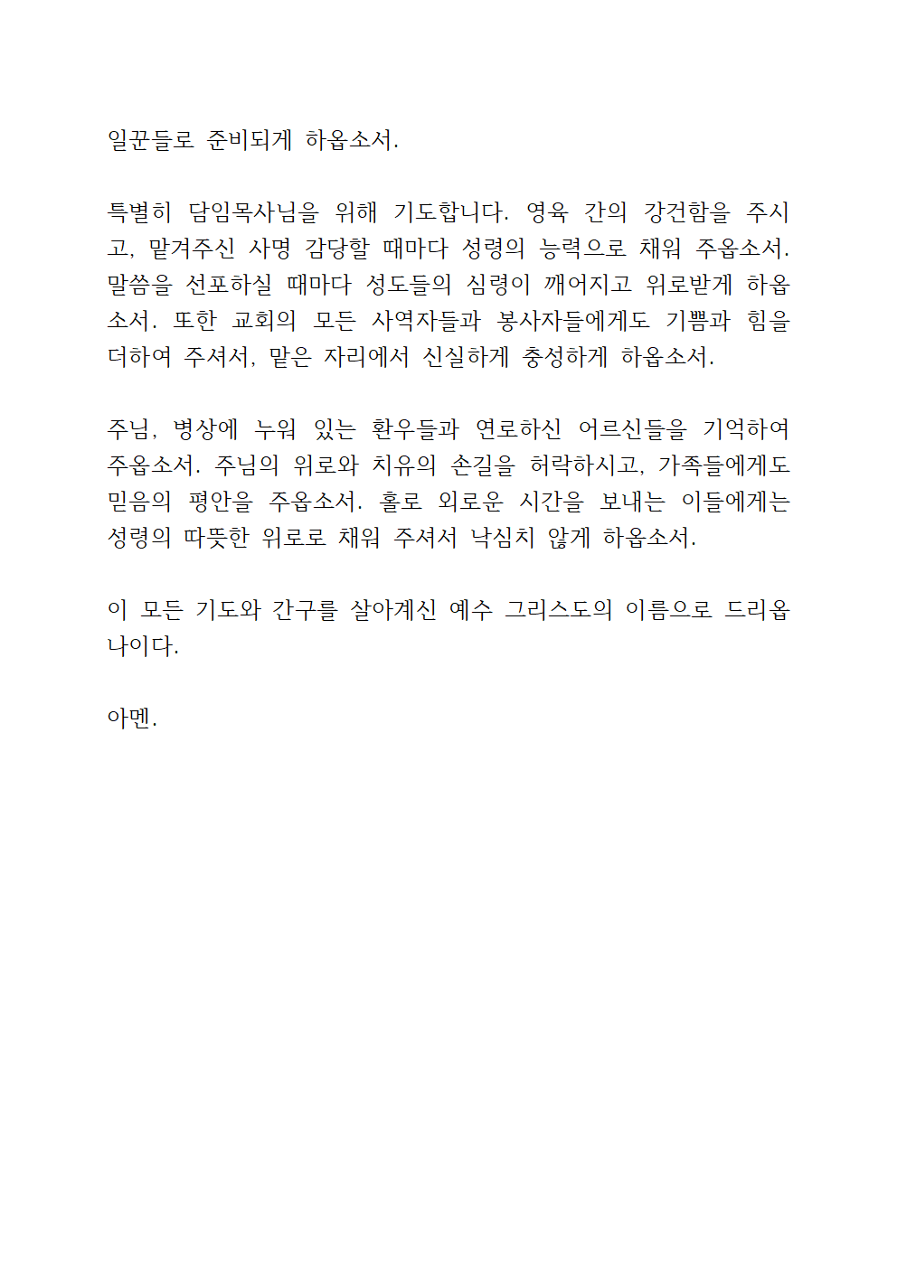 주님, 담임목사님을 비롯한 모든 사역자들에게 영육 간의 강건함을 주시고, 말씀과 기도로 교회를 이끌어 가실 때 성령 충만케 하옵소서. 봉사하는 손길마다 주님의 기쁨으로 채워 주셔서 맡은 직분에 감사하며 충성하게 하옵소서.