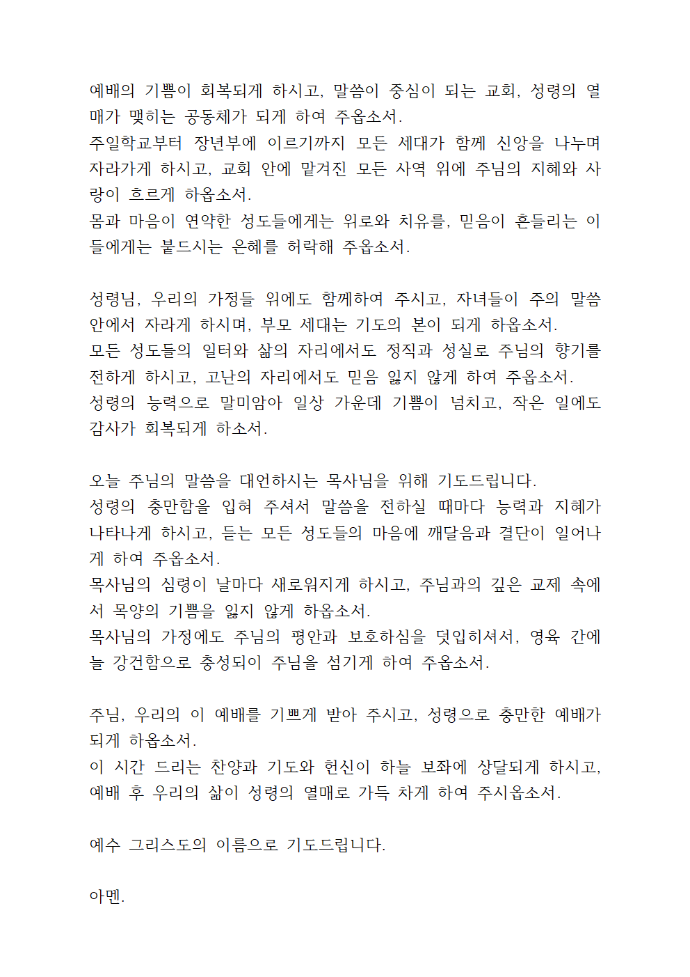 주님, 우리의 이 예배를 기쁘게 받아 주시고, 성령으로 충만한 예배가 되게 하옵소서. 이 시간 드리는 찬양과 기도와 헌신이 하늘 보좌에 상달되게 하시고, 예배 후 우리의 삶이 성령의 열매로 가득 차게 하여 주시옵소서.