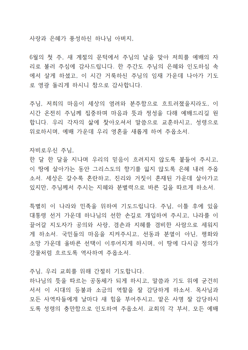 '2025년 6월 첫째 주일 대표기도문' 이번 글에서는 2025년 6월 첫째 주일 대표기도문을 안내해 드리겠습니다. 이번 6월 첫째 주일은 6월 1일로 대선을 이틀 앞둔 시기입니다. 그렇기 때문에 주일예배