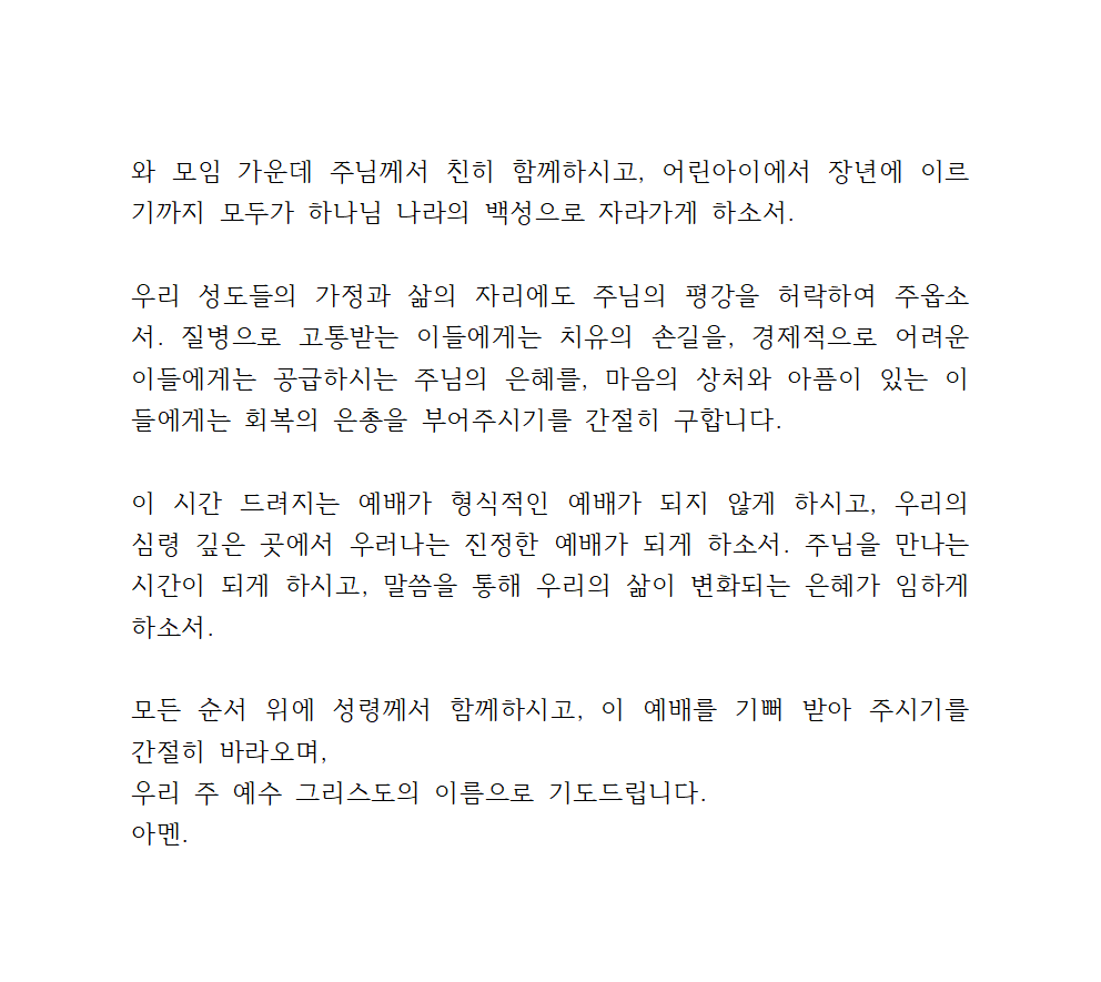 모든 순서 위에 성령께서 함께하시고, 이 예배를 기뻐 받아 주시기를 간절히 바라오며, 우리 주 예수 그리스도의 이름으로 기도드립니다.