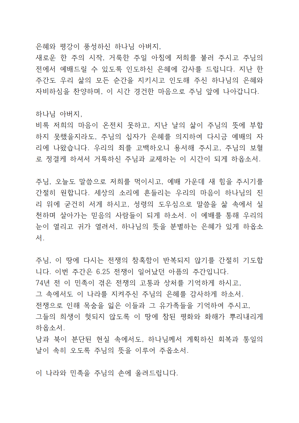 '2025년 6월 넷째주일 대표기도문' 이번 글에서는 2025년 6월 넷째 주일 대표기도문을 안내해 드리겠습니다. 6월 넷째 주는 75년 전에 6.25 전쟁이 있었던 주간이기 때문에이 주간 기도에서는 특히 우