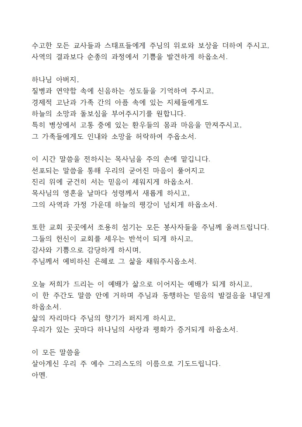 우리 가정과 교회를 위해 간구합니다. 가정마다 주님의 평화와 사랑이 가득 차게 하시고, 서로를 존중하고 세워주며 하나님 중심의 가정이 되게 하여 주옵소서. 교회를 세우신 주님의 뜻을 따라 모든 성도들이 한마음으로 협력하며, 주님의 나라를 확장하는 일에 힘쓰게 하여 주옵소서. 우리의 예배가 형식에 그치지 않고, 주님께 향한 진정한 사랑과 헌신의 고백이 되게 하여 주옵소서.
