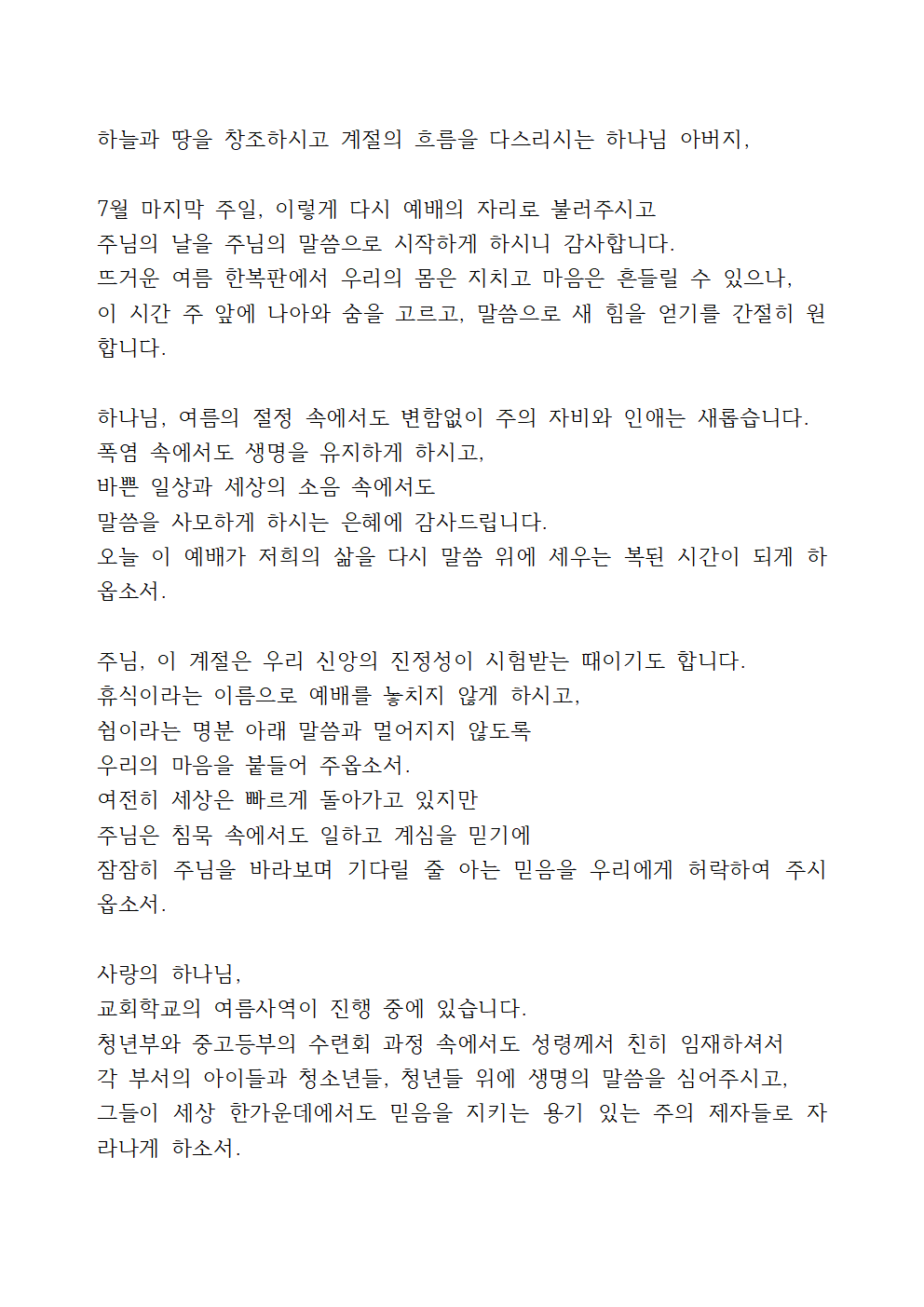 이번 글에서는 7월 넷째 주일낮예배 대표기도문을 안내해 드리겠습니다.